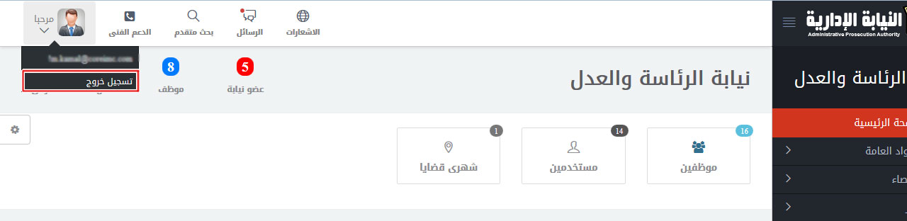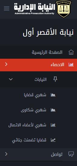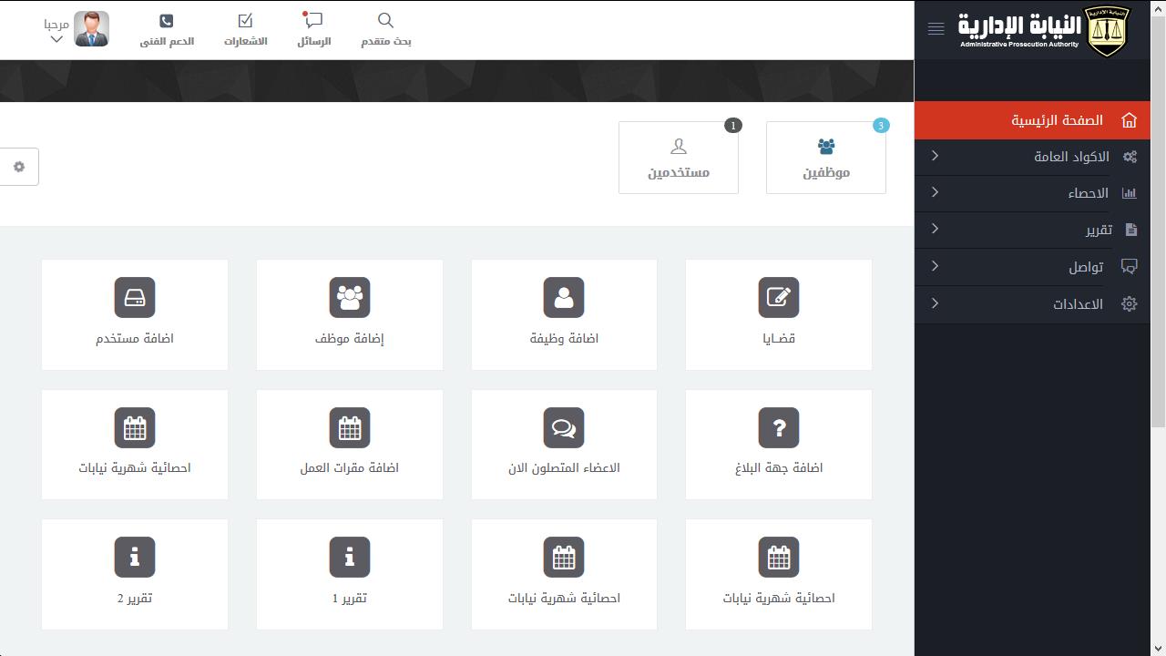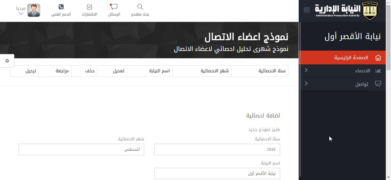 يتمكن المستخدم من رؤية الاحصائيات المختلفة "الخاصة بنيابته" التي سيتعامل معها وكما هو موضح بالشكل يظهر اسم النيابة الخاصة بالمستخدم الحالي للنظام .