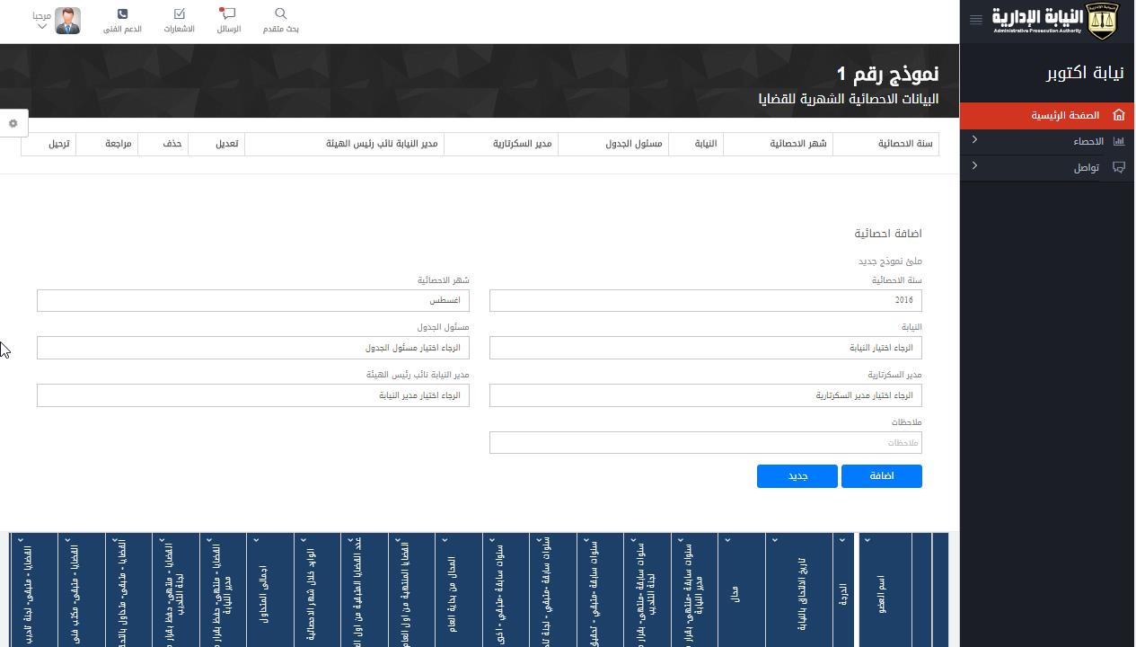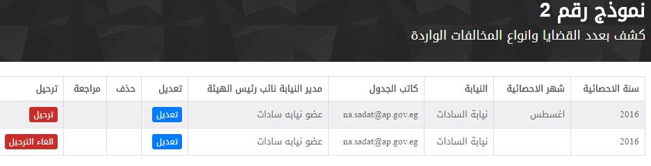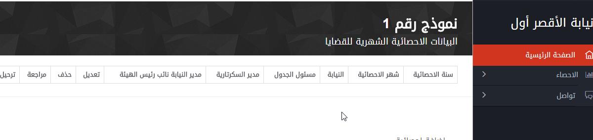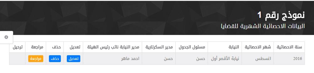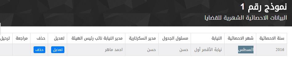 ملحوظة : يوجد حقول (مراجعة و ترحيل) ولا يوجد لهم زر للتعامل معهم وذلك لأن المستخدم الحالي ليس مسموح له ذلك أي أنها من اختصاص مستخدمين أخرين فالمراجعة تتم من مشرف الاحصائيات في النيابة أما الترحيل فهو من اختصاص وحدة الاحصاء في رئاسة الهيئة ومعناه أن هذه الاحصائية تمت مراجعتها عن طريق وحدة الاحصاء.