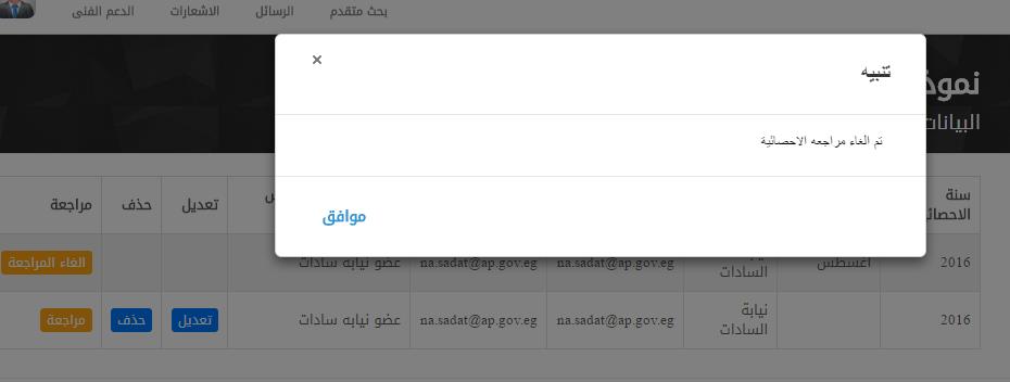وبعد مراجعة الاحصائية اذا وجد المشرف تعديل قام بالتعديل واذا لم يجد يقوم المشرف بالنقر على زر (مراجعة) فتتحول الحالة الى (الغاء المراجعة) نتيجة انه تمت المراجعة كما هو موضح بالشكل التالي : وفى نفس الوقت نجد أن الاحصائية تختفى من مستخدم الاحصائية كما بالشكل