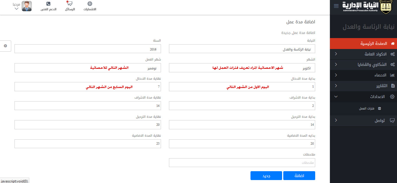 تحدد فترات العمل لادخال احصائيات النيابات كما في الشكل التالي